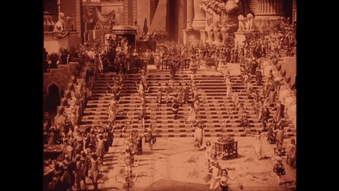 Where does the first part end? Prince Belshazzar (Alfred Paget) and The Princess Beloved (Seena Owen) embrace one another following an epic battle within Babylon.